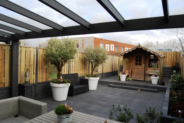 Terrasoverkapping met zonwering en RVS spots geplaatst in Tiel